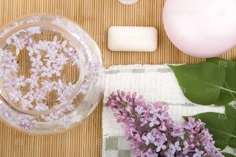 Ветка сирени, полотенце и мыло на соломенном фоне