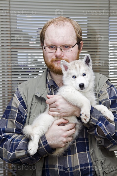Щенок породы сибирский хаски на руках у хозяина