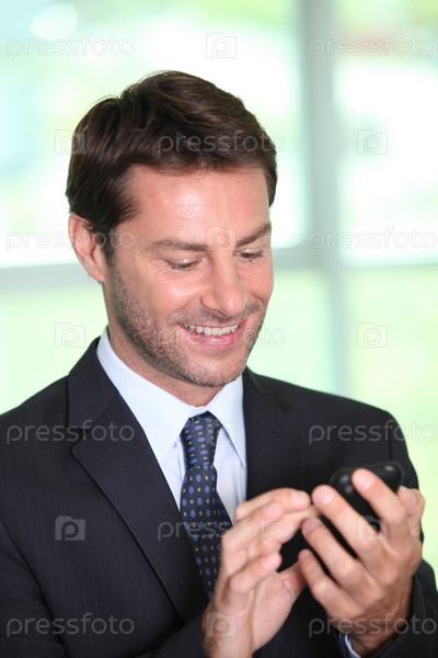 Бизнесмен набирает сообщение на мобильном телефоне