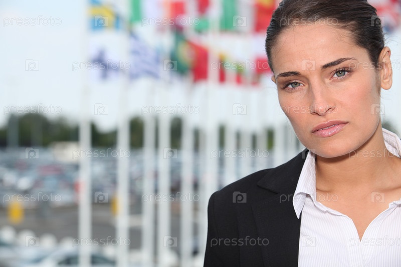 Женщина стоящая перед различными национальными флагами