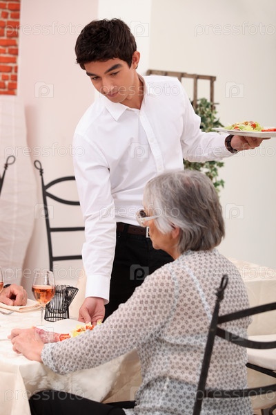 Официант подает блюдо