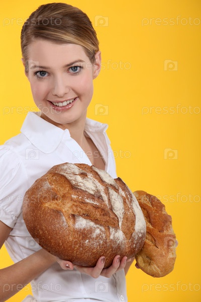 Женщина держит караваи хлеба