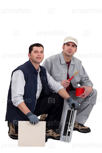 Маляр и рабочий на коленях рядом