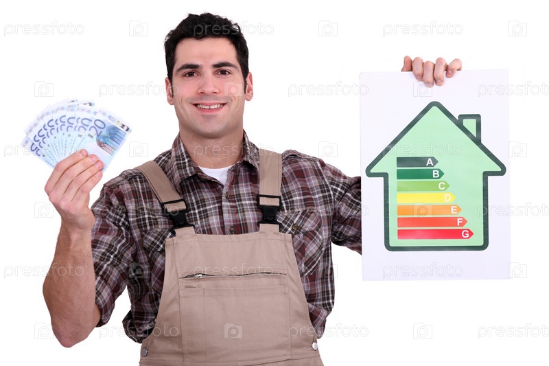 Рабочий держит деньги и диаграмму потребления энергии домом