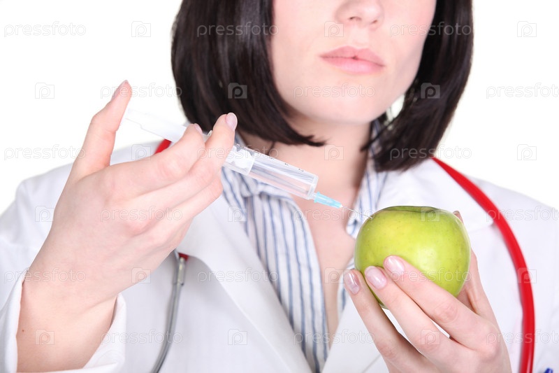 Доктор вводит гормон в яблоко