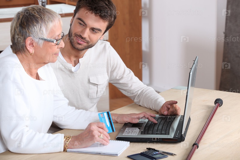 Молодой человек помогает пожилой женщине совершить покупку он-лайн