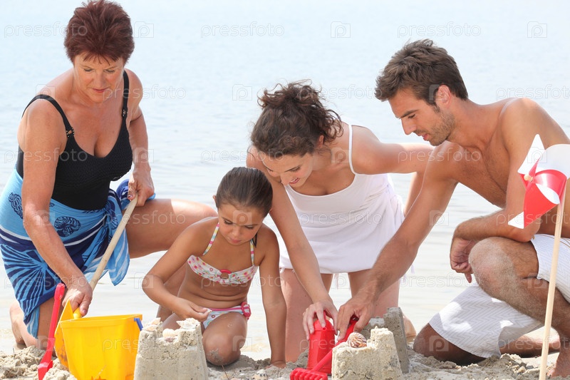 Семья делает песочные замки