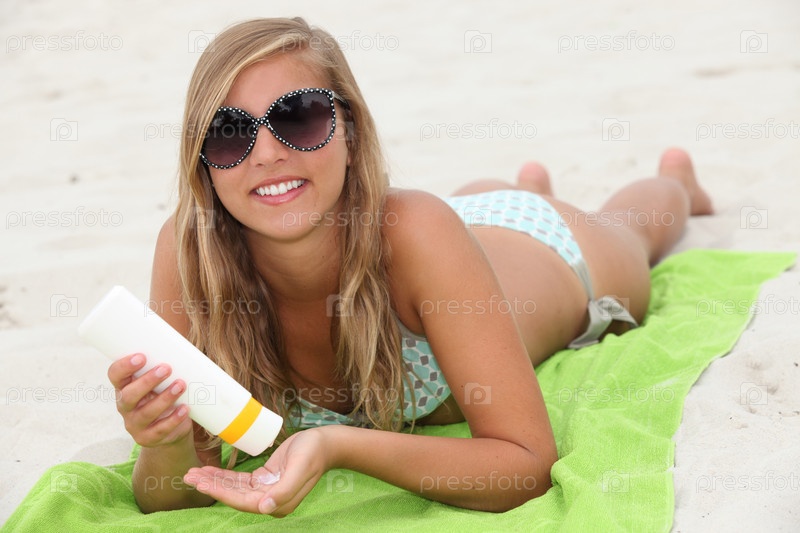 Молодая женщина использует солнцезащитный крем на пляже