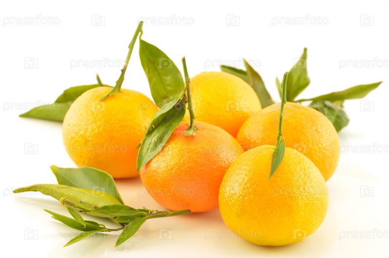 Мандарины с листочками на белом фоне