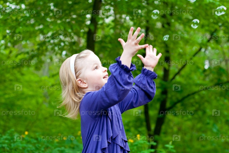 Маленькая девочка ловит мыльные пузыри в парке