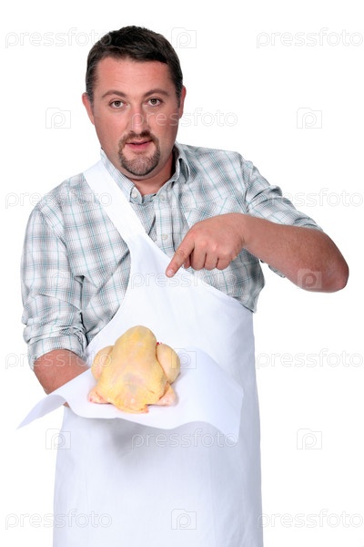 Повар с курицей в руках
