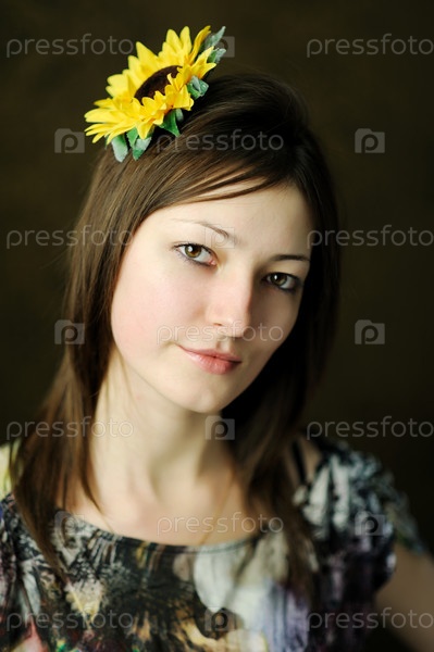 Портрет красивой женщины с подсолнухом в волосах
