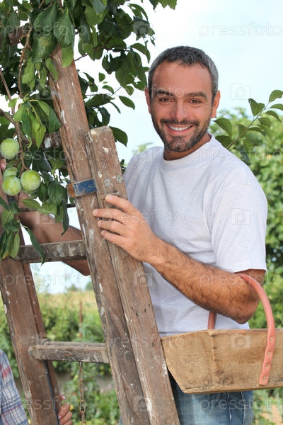 Мужчина с лестницей во время сбора фруктов