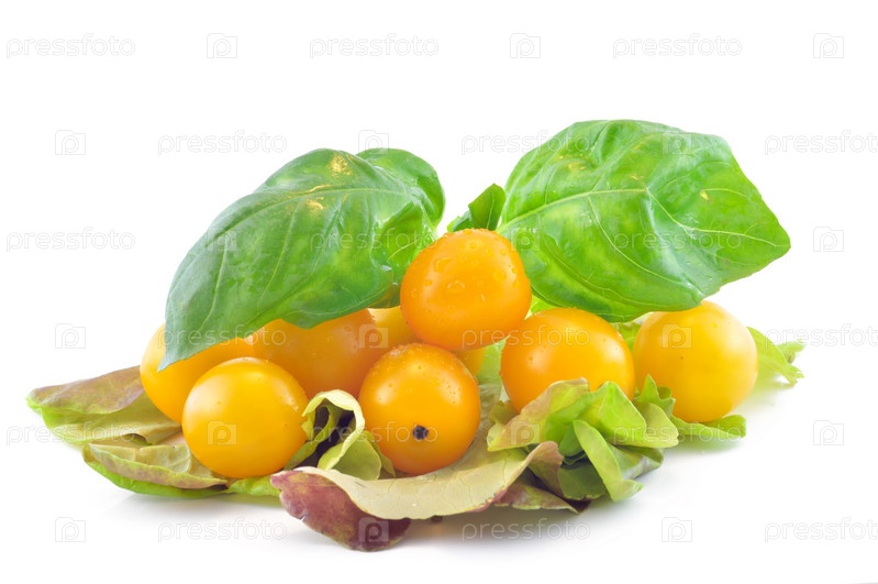 Помидоры черри с листьями базилика и салата