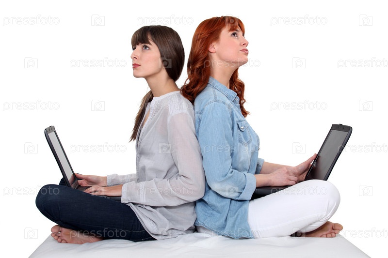 Две подруги сидят рядос, держа ноутбуки на коленях