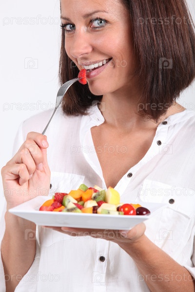 Женщина ест фруктовый салат