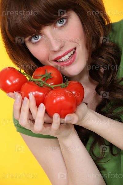 Портрет рыжеволосой девушки, позирующей с гроздью томатов
