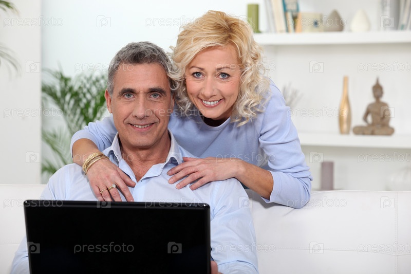 Пожилая пара с ноутбуком в домашней обстановке