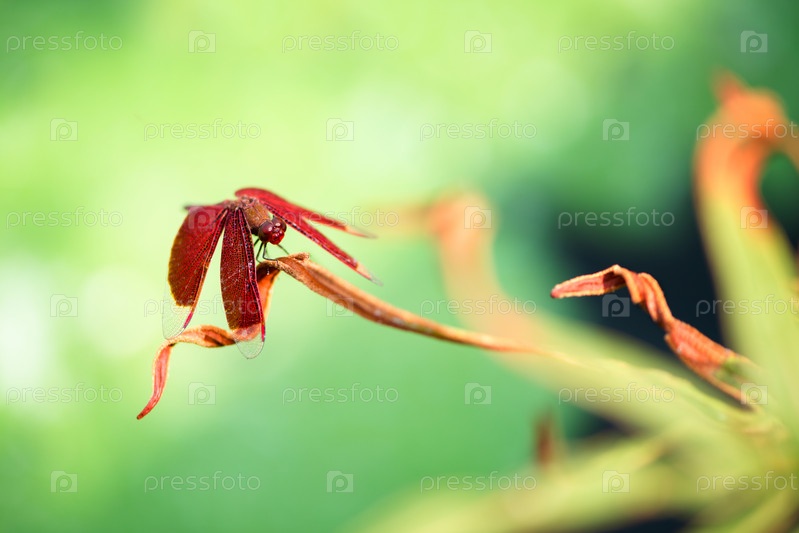Красная стрекоза отдыхает на листе