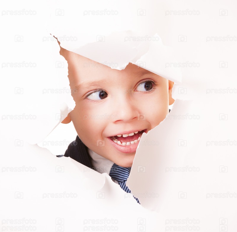 Лицо любопытного ребенка в бумажном отверстии