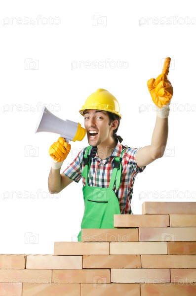 Мужчина строитель с громкоговорителем в руках