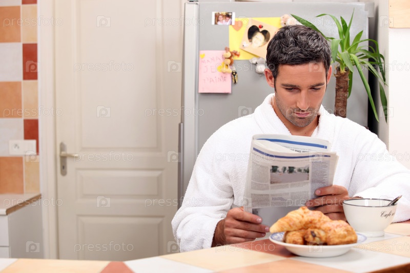 Человек читает газету во время завтрака