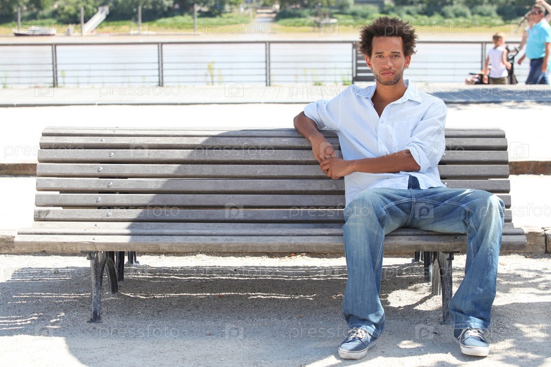 Молодой человек сидит на скамейке на улице