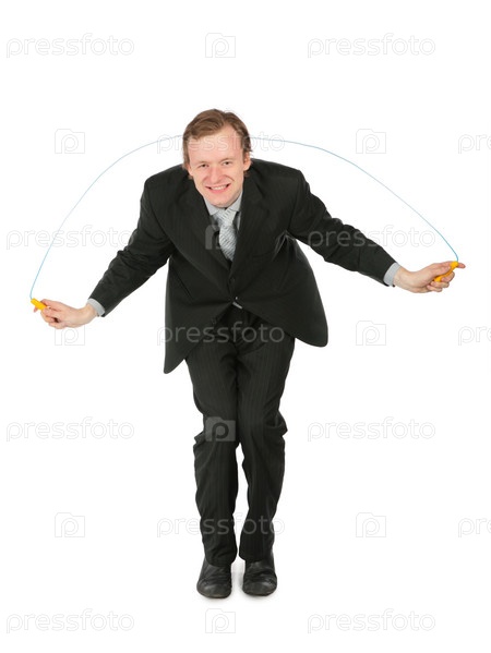 Молодой человек в деловом костюме прыгает через скакалку, изолированный на белом фоне