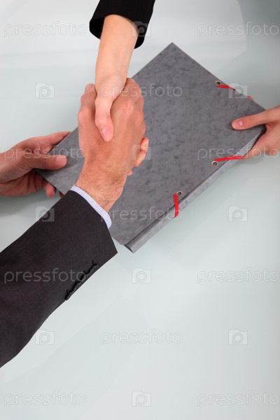 Деловые люди пожимают руки на фоне папки