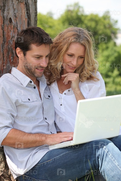 Пара с ноутбуком у дерева