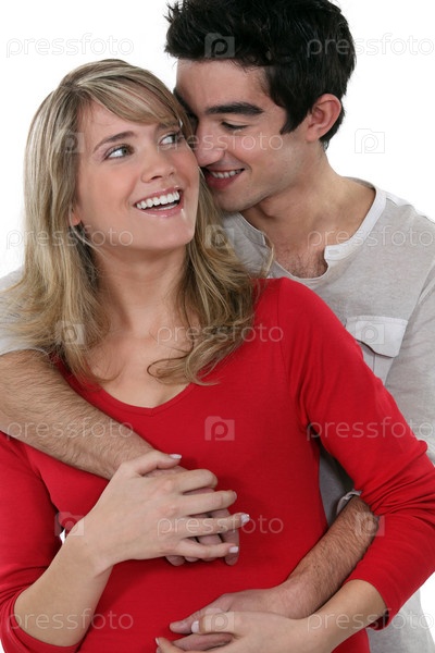 Молодая счастливая пара обнимается на белом фоне