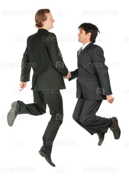 Бизнесмены жмут друг другу руки в прыжке, изолированные на белом фоне