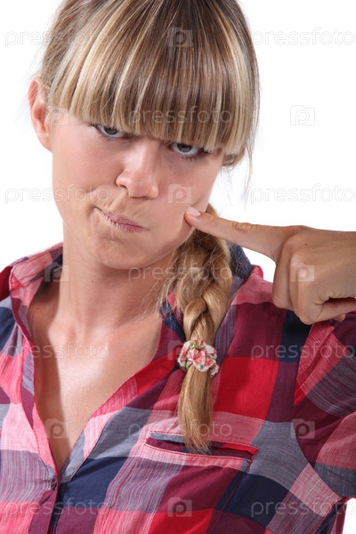 Блондинка касается своего лица