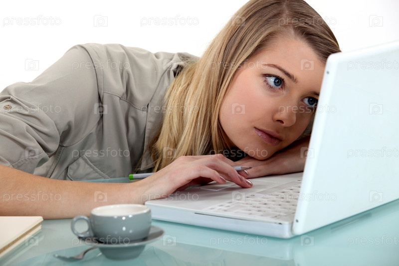 Молодая женщина скучает перед компьютером
