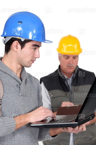 Молодой мастер работает на ноутбуке в то время как старший мастер джелает заметки