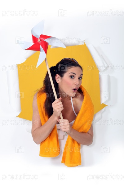 Женщина держит игрушечную ветряную мельницу