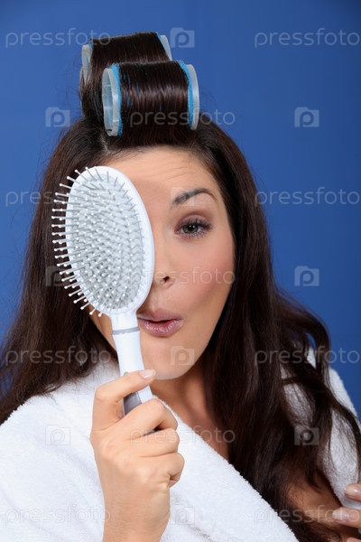 Смешная женщина с бигуди и расческой