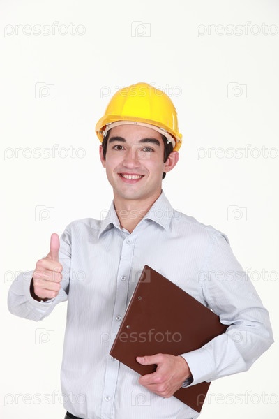 Веселый архитектор показывает палец вверх