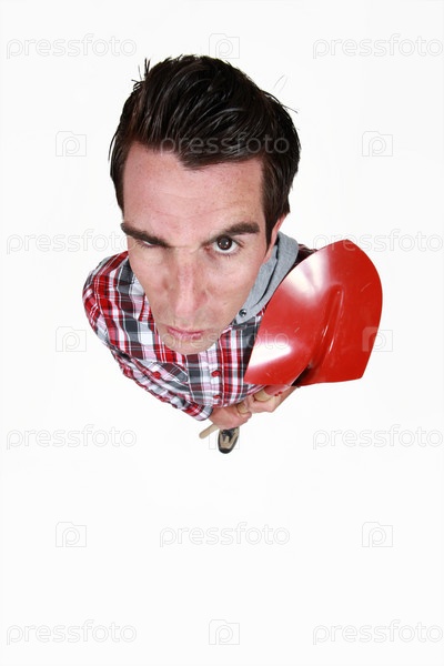 Смешной портрет каменщика с красной лопатой