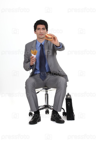 Бизнесмен ест гамбургер и картошку