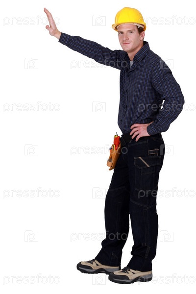 Строительный рабочий держиит руку перед пустым пространством