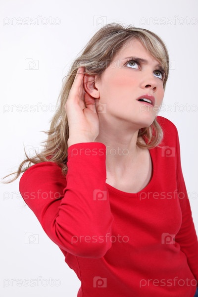 Женщина с рукой. приложенной к уху