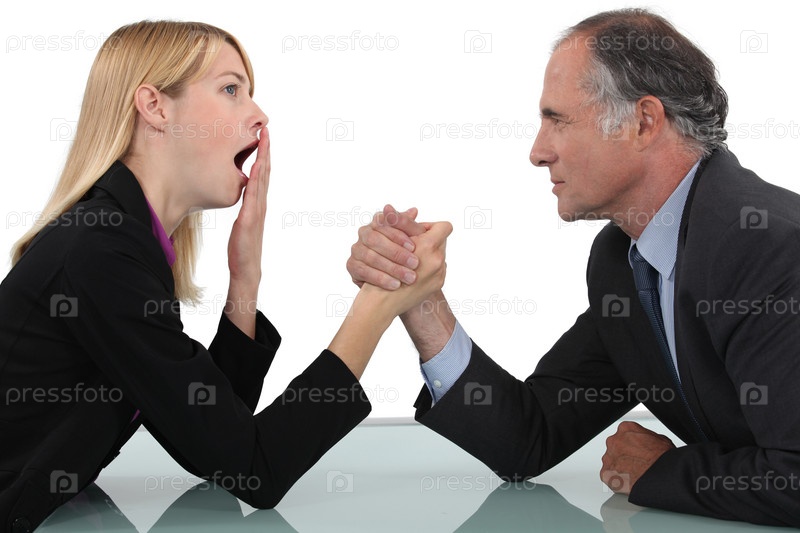 Женщина занимается армреслингом с боссом