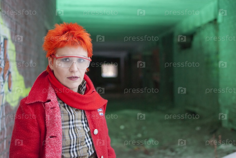 Рыжая женщина стоит у входа в зеленоватый туннель