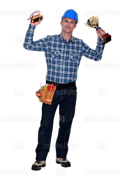 Электрик, держащий измерительный инструмент и золотой кубок