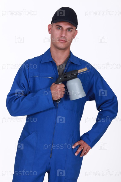 Рабочий держит сварочную горелку