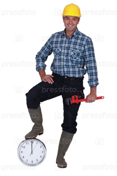 Счастливый рабочий опирается на часы