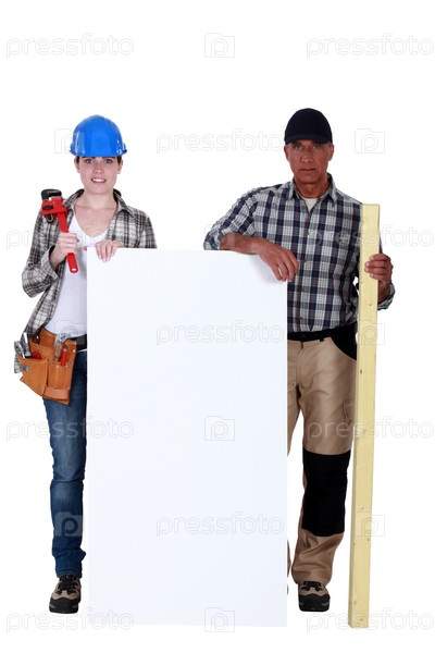 Сантехник и плотник с пустым плакатом