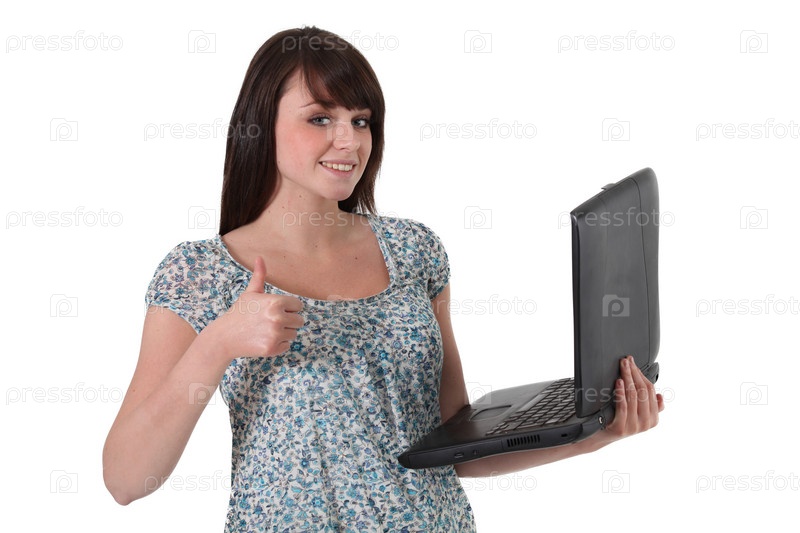 Брюнетка с ноутбуком в руке
