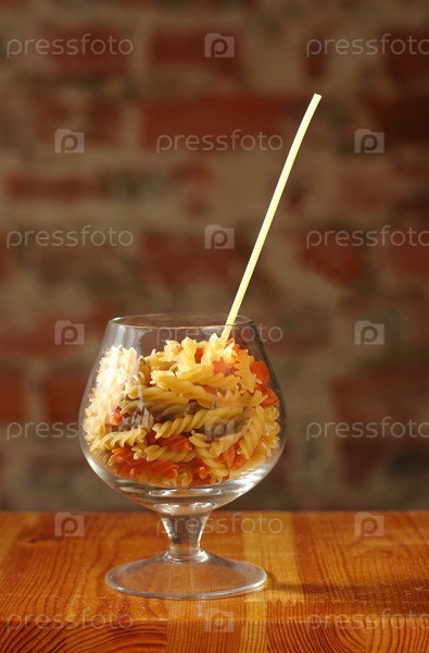 Макароны в фужере с соломинкой спагетти на фоне кирпичной стены